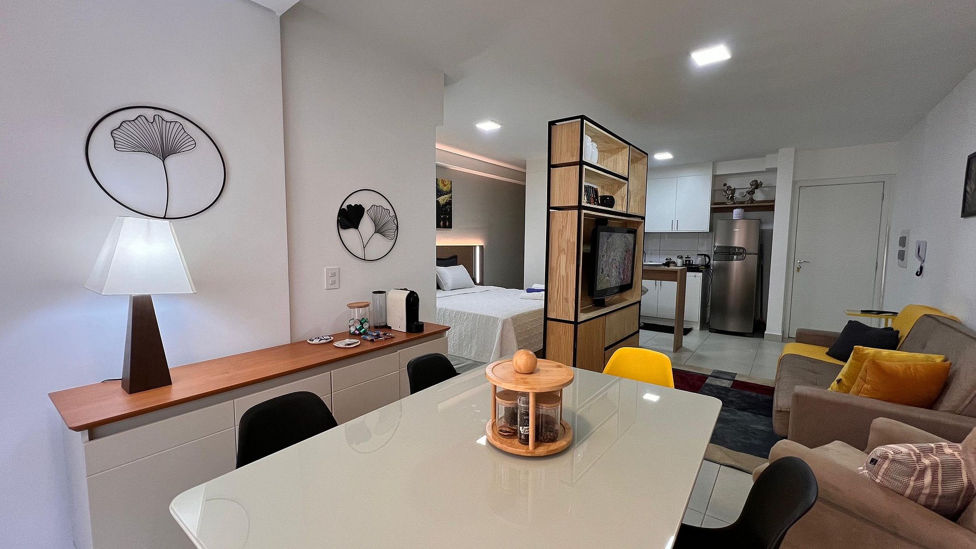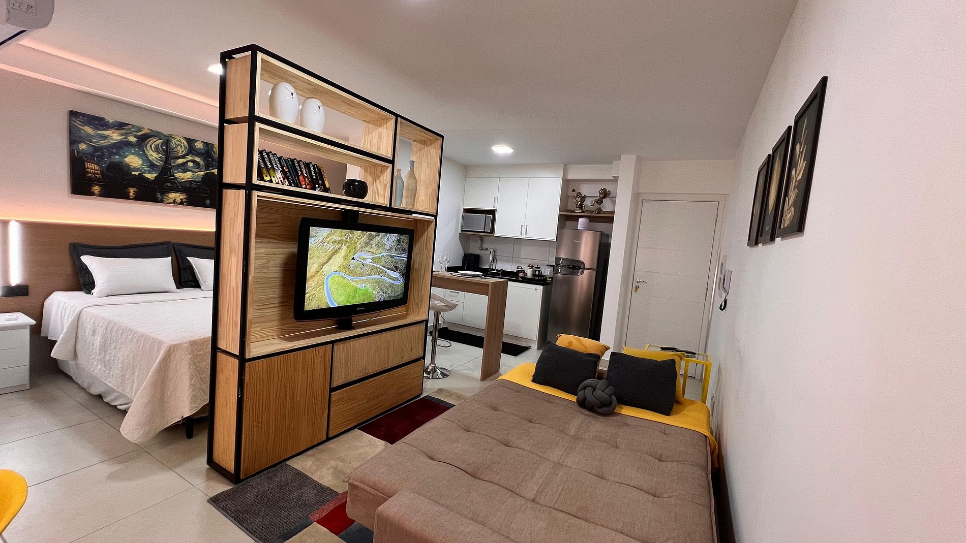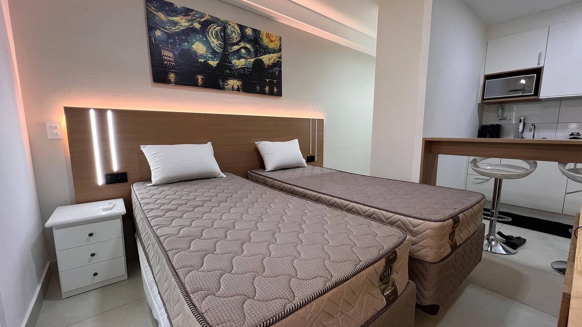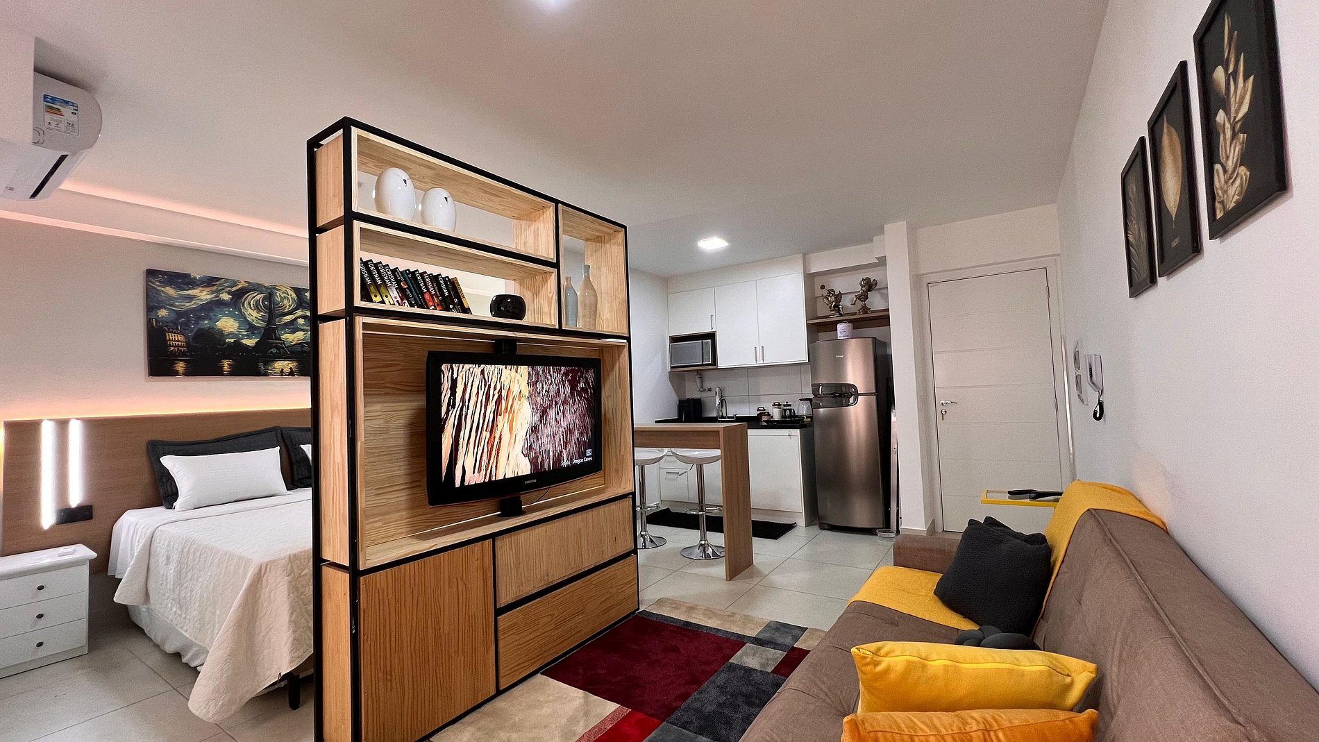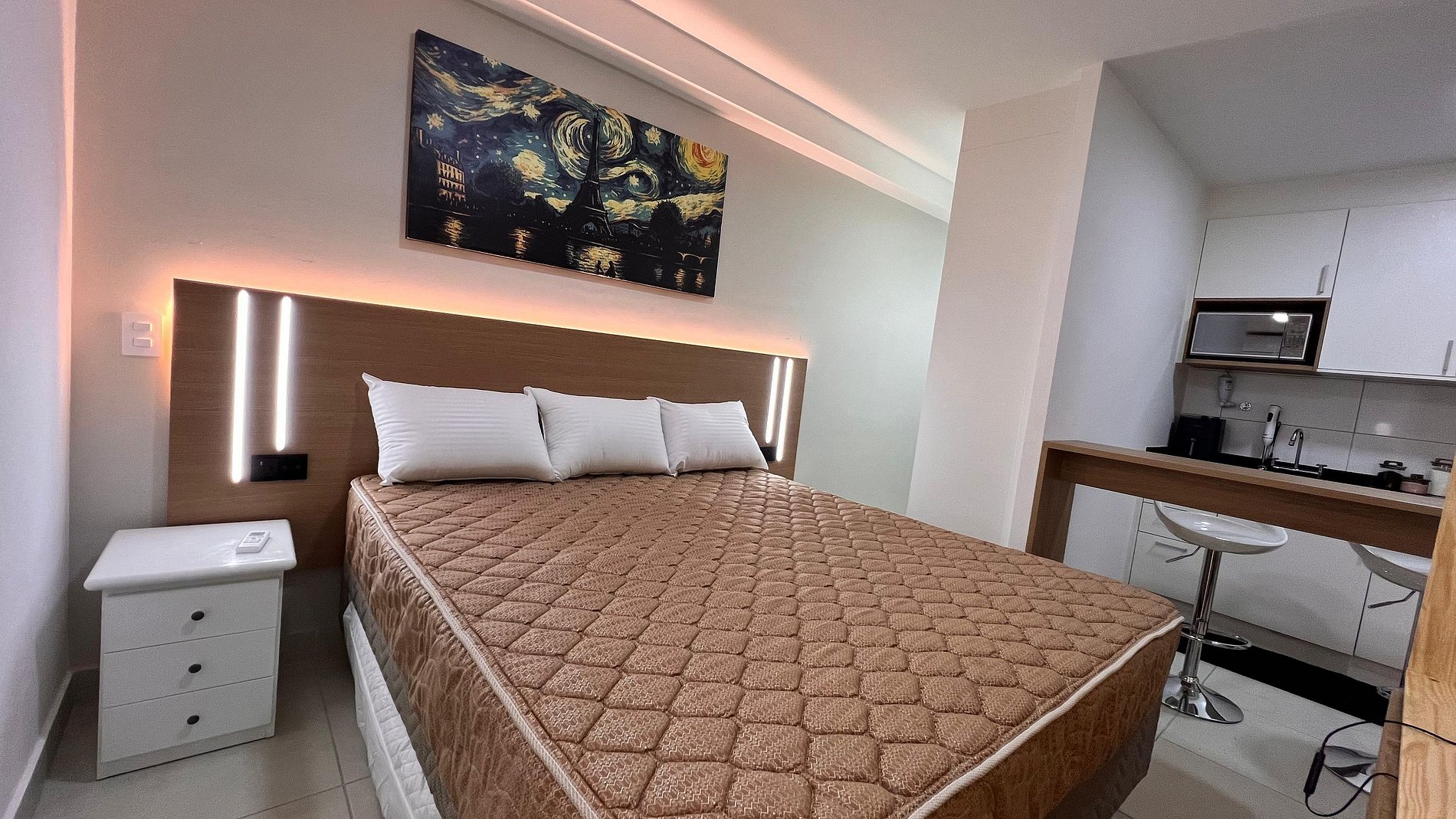 A Sunny Studio é surpreendente, novinho e todo mobiliado: • 01 suítes com ar condicionado, com cama de casal, armarios • 01 sala com ar condicionado, com sofá cama de casal • Roupas de cama e banho disponíveis gratuitamente em sua estadia • Cozinha equipada com variedade de louças e eletro-domésticos: AirFryer, Mixer, Microondas, Filtro de água, Geladeira com freezer, Bule elétrico, Prensa francesa, Cafeteira Nespresso • Estacionamento gratuito para 01 automóvel • Segurança completa, portaria com reconhecimento facial, self Checkin, detectores de fumaça e monóxido de carbono • Piscina climatizada • Escritório completo e sala de reuniões rotativa nas dependências do condomínio (*agendamento mediante a disponibilidade) • Sala de beleza e sala de massagem rotativa nas dependências do condomínio (agendamento mediante a disponibilidade) • Spa aquecido (*agendamento mediante a disponibilidade) • Self check-in por senha • Early checkin ou Late checkout mediante a disponibilidade de agenda (Consulte taxas extras) • Flexibilidade de no máximo 1 hora gratuitamente no checkin ou checkout (*mediante a disponibilidade de agenda) * A Piscina é climatizada, podendo estar mais fria em dias nublados ou com pouca incidência de sol, principalmente no inverno