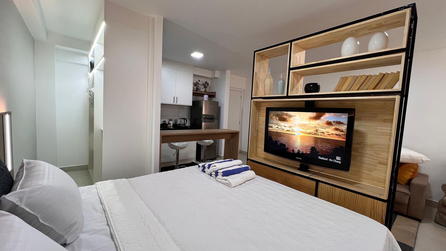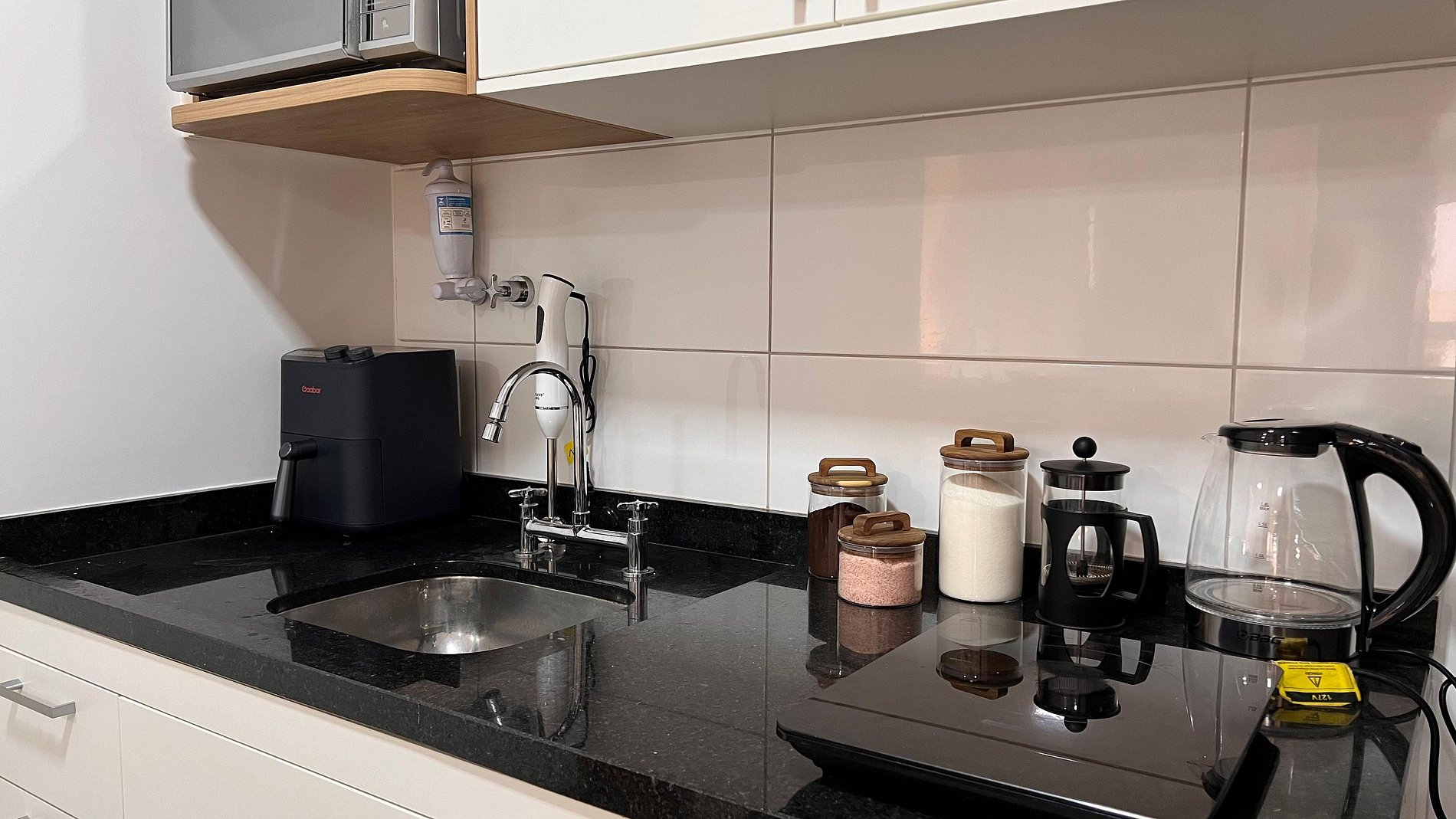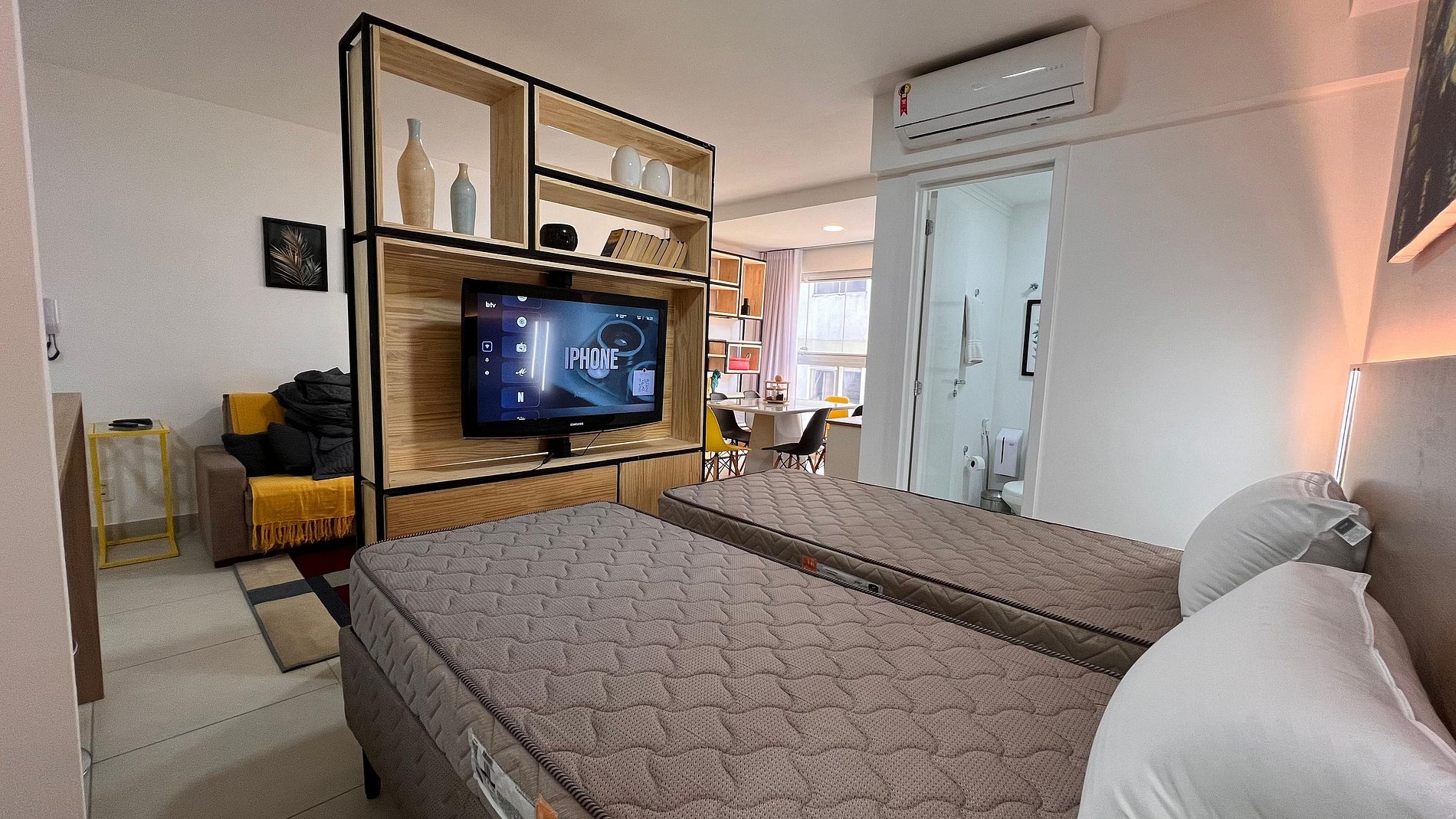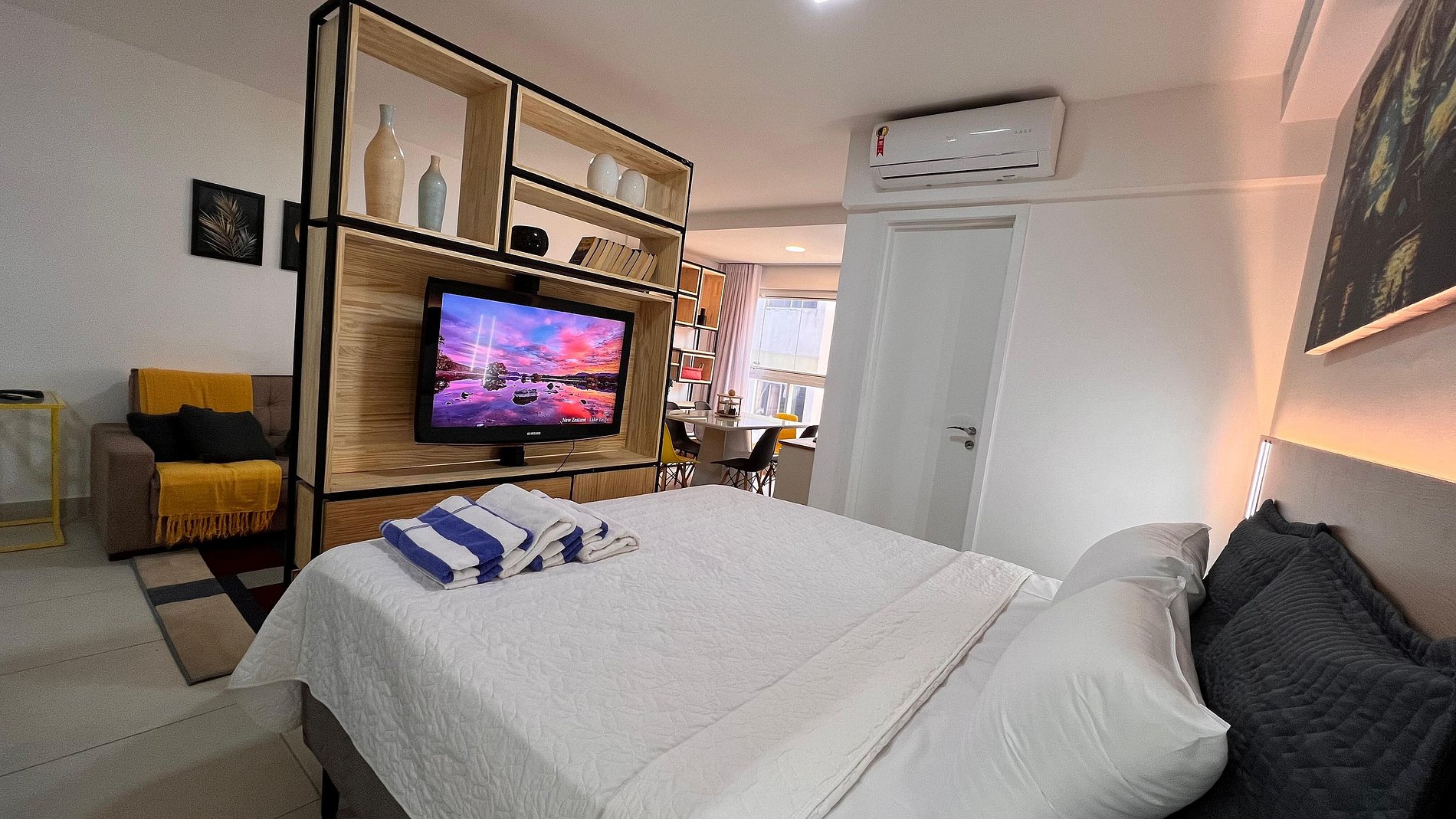 A Sunny Studio é surpreendente, novinho e todo mobiliado: • 01 suítes com ar condicionado, com cama de casal, armarios • 01 sala com ar condicionado, com sofá cama de casal • Roupas de cama e banho disponíveis gratuitamente em sua estadia • Cozinha equipada com variedade de louças e eletro-domésticos: AirFryer, Mixer, Microondas, Filtro de água, Geladeira com freezer, Bule elétrico, Prensa francesa, Cafeteira Nespresso • Estacionamento gratuito para 01 automóvel • Segurança completa, portaria com reconhecimento facial, self Checkin, detectores de fumaça e monóxido de carbono • Piscina climatizada • Escritório completo e sala de reuniões rotativa nas dependências do condomínio (*agendamento mediante a disponibilidade) • Sala de beleza e sala de massagem rotativa nas dependências do condomínio (agendamento mediante a disponibilidade) • Spa aquecido (*agendamento mediante a disponibilidade) • Self check-in por senha • Early checkin ou Late checkout mediante a disponibilidade de agenda (Consulte taxas extras) • Flexibilidade de no máximo 1 hora gratuitamente no checkin ou checkout (*mediante a disponibilidade de agenda) * A Piscina é climatizada, podendo estar mais fria em dias nublados ou com pouca incidência de sol, principalmente no inverno