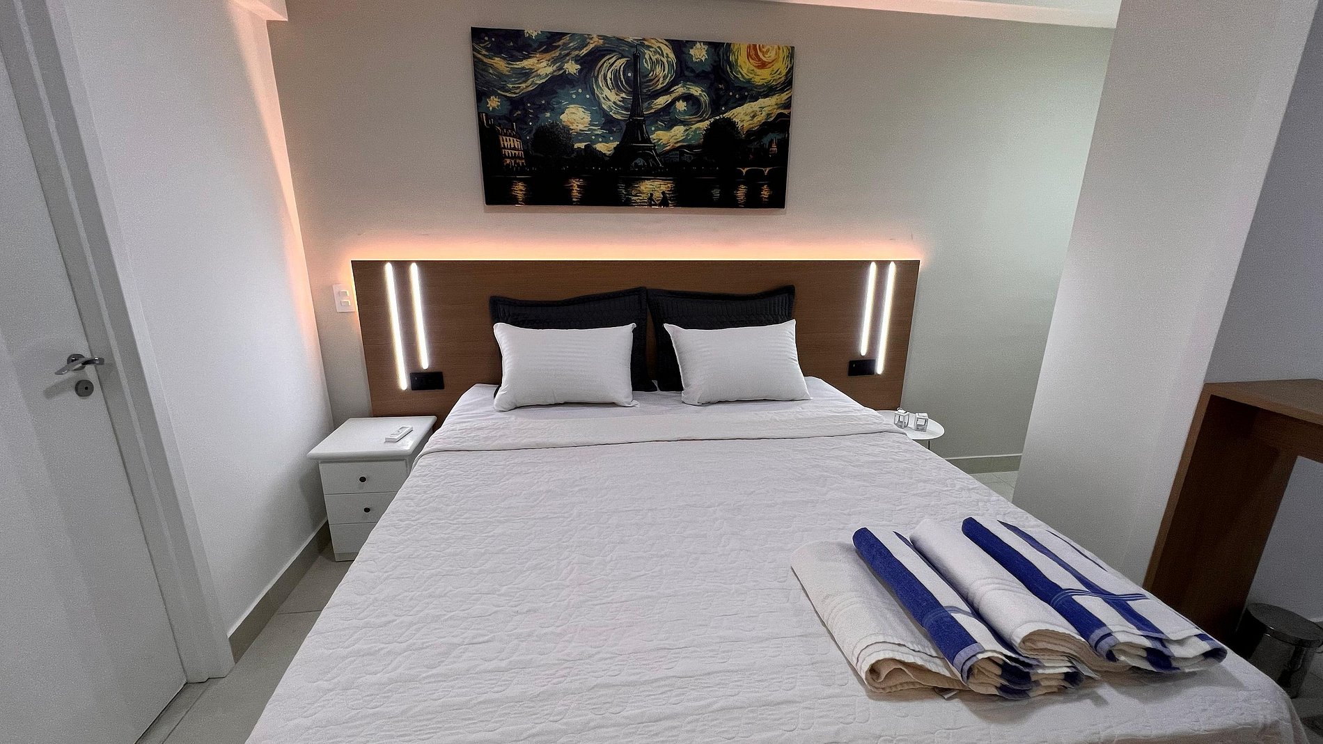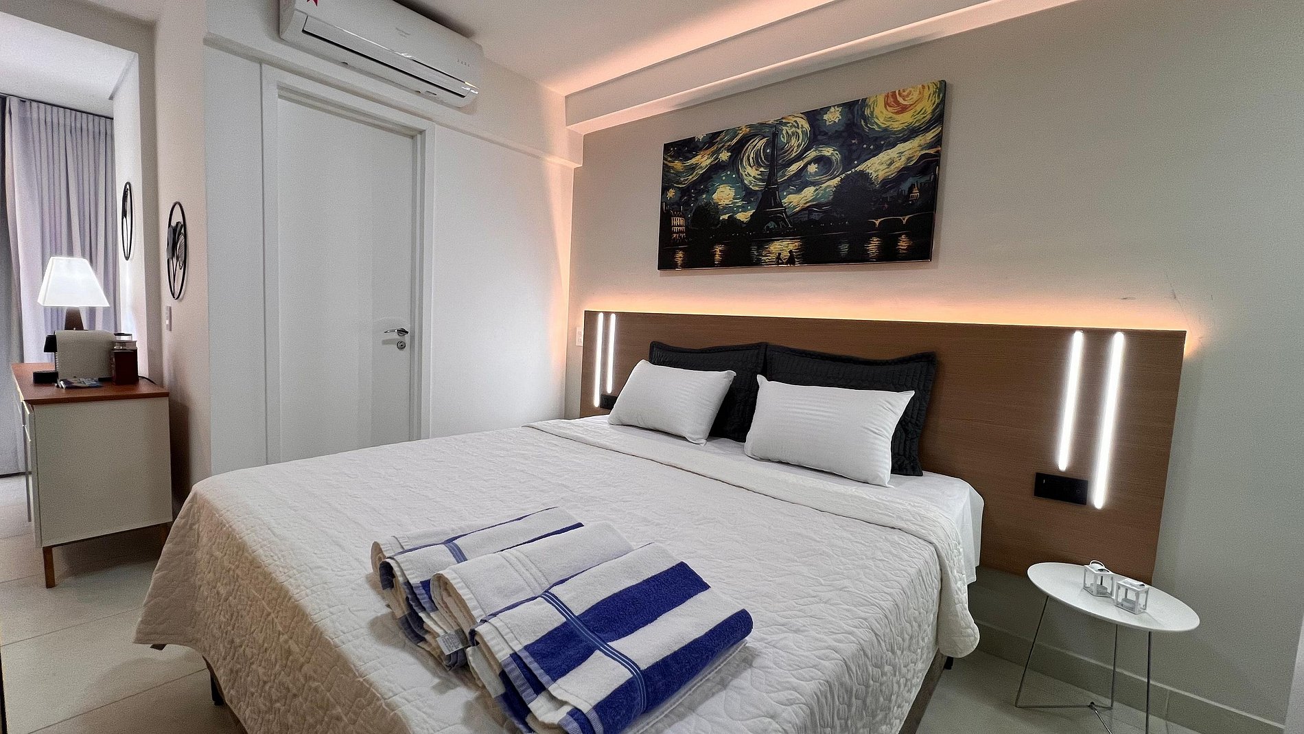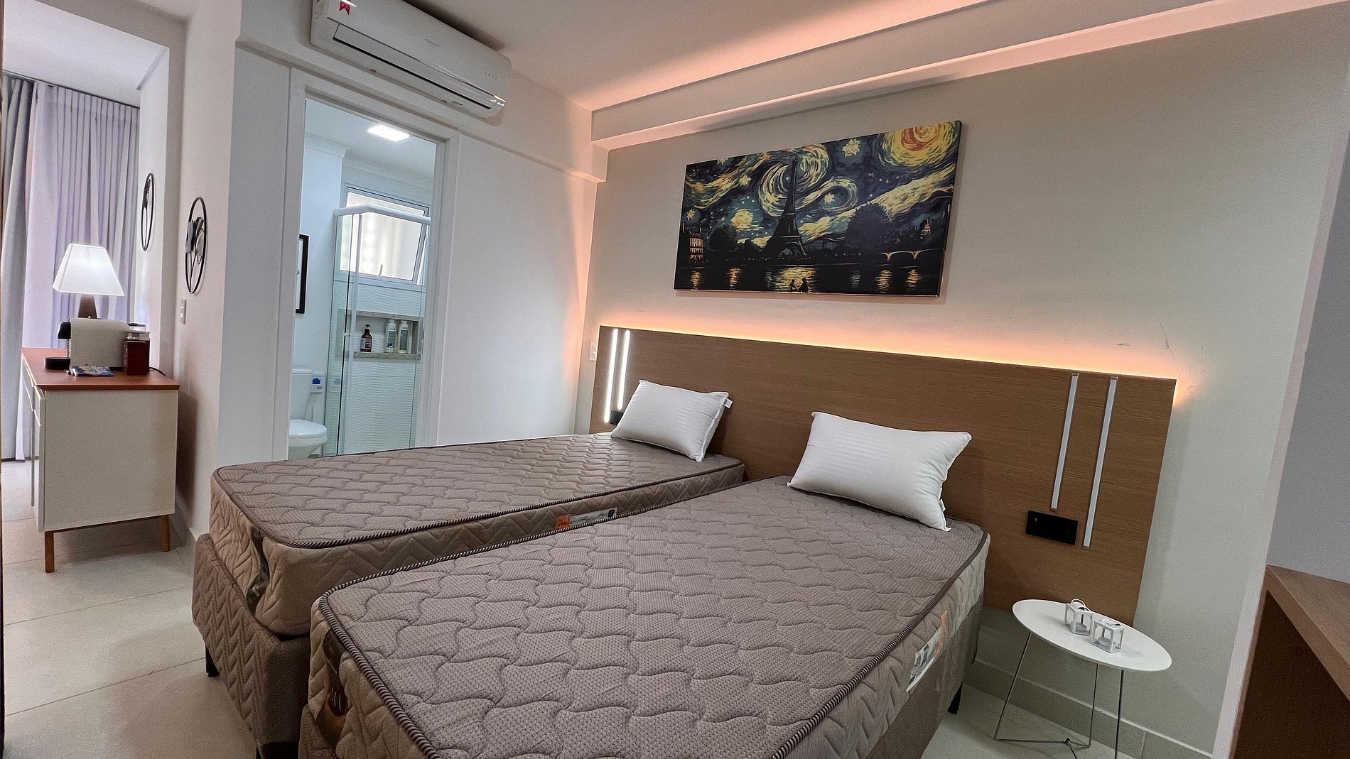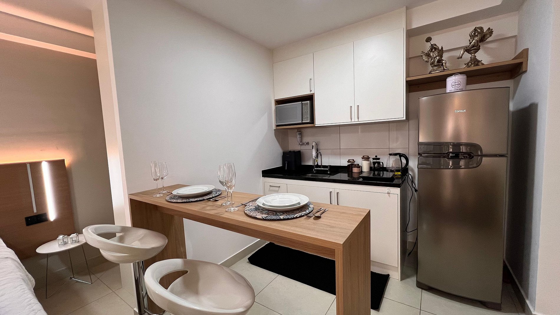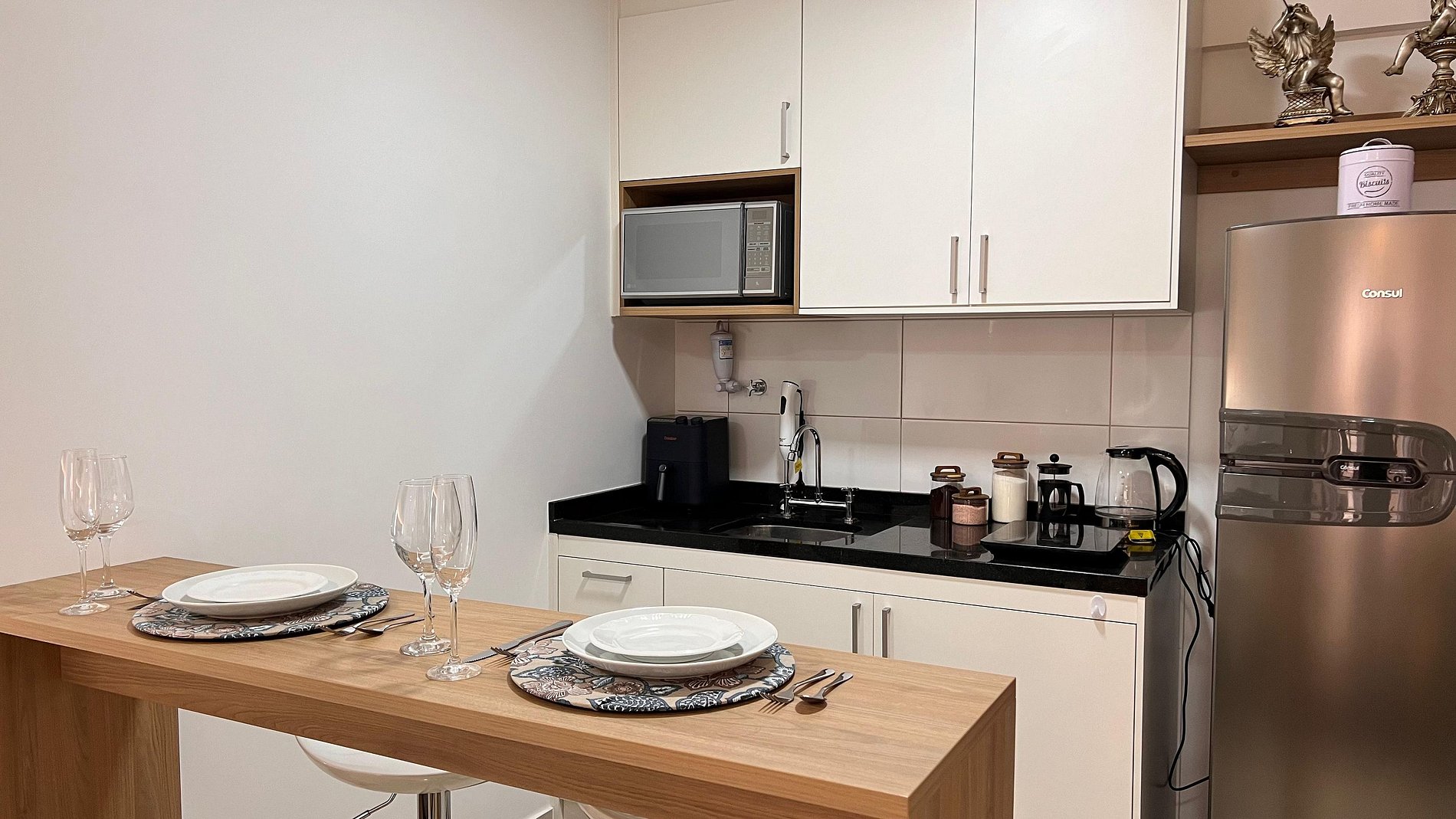 A Sunny Studio é surpreendente, novinho e todo mobiliado: • 01 suítes com ar condicionado, com cama de casal, armarios • 01 sala com ar condicionado, com sofá cama de casal • Roupas de cama e banho disponíveis gratuitamente em sua estadia • Cozinha equipada com variedade de louças e eletro-domésticos: AirFryer, Mixer, Microondas, Filtro de água, Geladeira com freezer, Bule elétrico, Prensa francesa, Cafeteira Nespresso • Estacionamento gratuito para 01 automóvel • Segurança completa, portaria com reconhecimento facial, self Checkin, detectores de fumaça e monóxido de carbono • Piscina climatizada • Escritório completo e sala de reuniões rotativa nas dependências do condomínio (*agendamento mediante a disponibilidade) • Sala de beleza e sala de massagem rotativa nas dependências do condomínio (agendamento mediante a disponibilidade) • Spa aquecido (*agendamento mediante a disponibilidade) • Self check-in por senha • Early checkin ou Late checkout mediante a disponibilidade de agenda (Consulte taxas extras) • Flexibilidade de no máximo 1 hora gratuitamente no checkin ou checkout (*mediante a disponibilidade de agenda) * A Piscina é climatizada, podendo estar mais fria em dias nublados ou com pouca incidência de sol, principalmente no inverno
