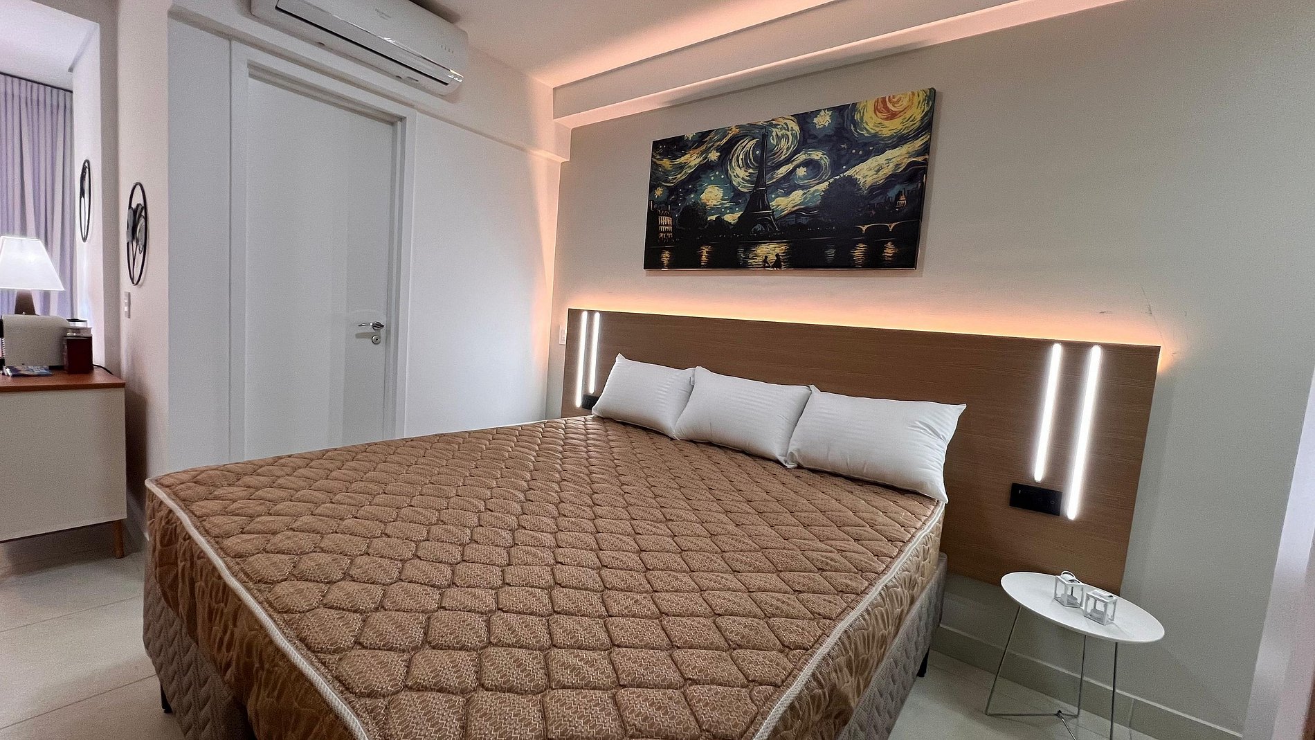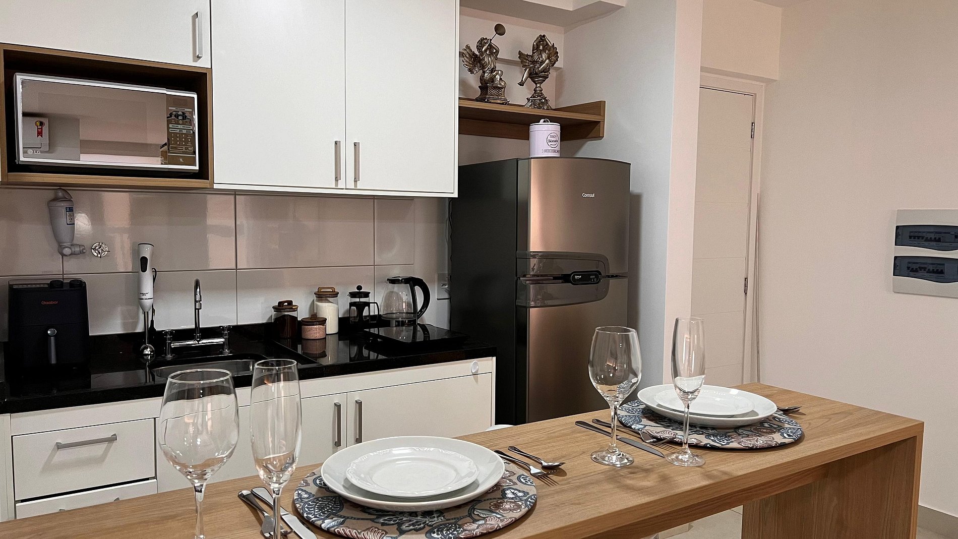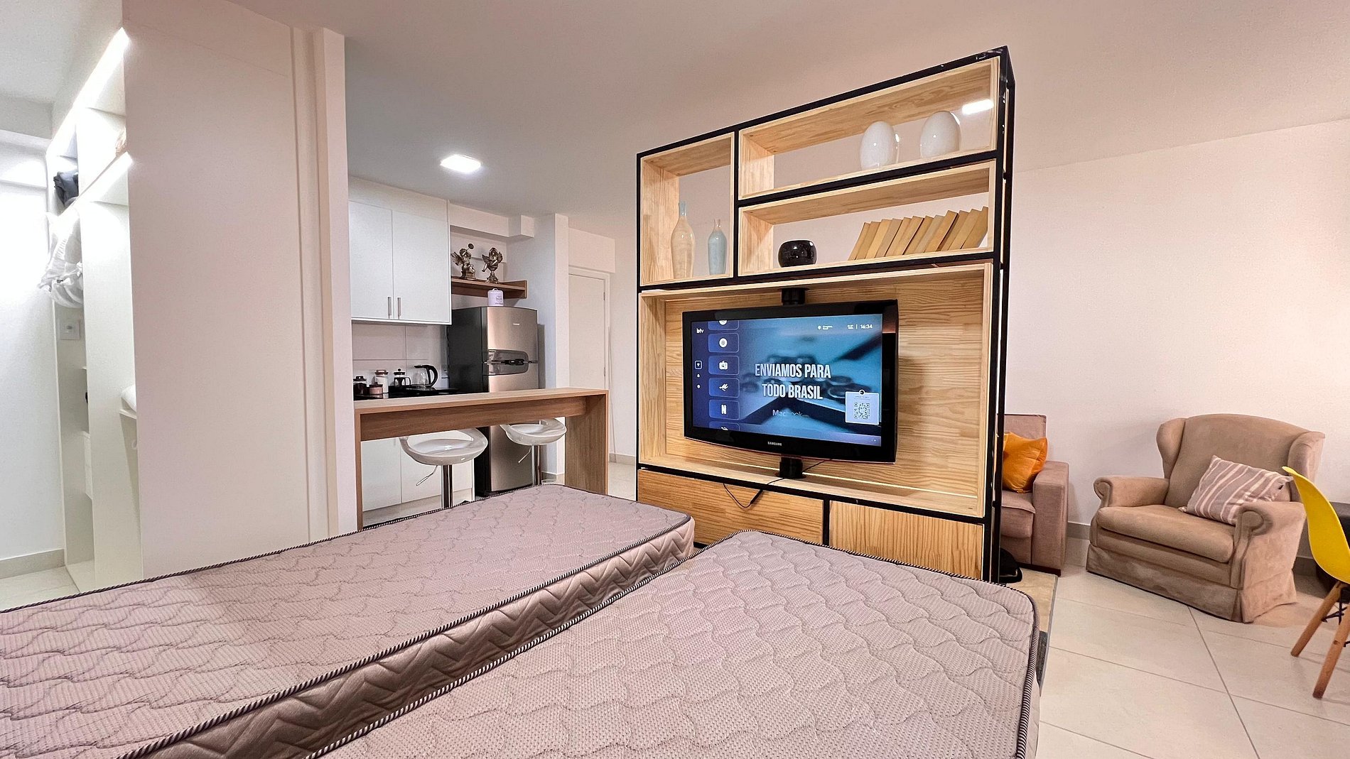 A Sunny Studio é surpreendente, novinho e todo mobiliado: • 01 suítes com ar condicionado, com cama de casal, armarios • 01 sala com ar condicionado, com sofá cama de casal • Roupas de cama e banho disponíveis gratuitamente em sua estadia • Cozinha equipada com variedade de louças e eletro-domésticos: AirFryer, Mixer, Microondas, Filtro de água, Geladeira com freezer, Bule elétrico, Prensa francesa, Cafeteira Nespresso • Estacionamento gratuito para 01 automóvel • Segurança completa, portaria com reconhecimento facial, self Checkin, detectores de fumaça e monóxido de carbono • Piscina climatizada • Escritório completo e sala de reuniões rotativa nas dependências do condomínio (*agendamento mediante a disponibilidade) • Sala de beleza e sala de massagem rotativa nas dependências do condomínio (agendamento mediante a disponibilidade) • Spa aquecido (*agendamento mediante a disponibilidade) • Self check-in por senha • Early checkin ou Late checkout mediante a disponibilidade de agenda (Consulte taxas extras) • Flexibilidade de no máximo 1 hora gratuitamente no checkin ou checkout (*mediante a disponibilidade de agenda) * A Piscina é climatizada, podendo estar mais fria em dias nublados ou com pouca incidência de sol, principalmente no inverno