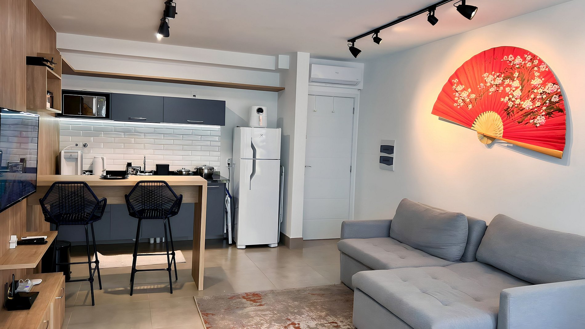 • Cozinha equipada com variedade de louças e eletro-domésticos: AirFryer, Mixer, Microondas, Filtro de água, Geladeira com freezer, Bule elétrico, Prensa francesa, Cafeteira Nespresso